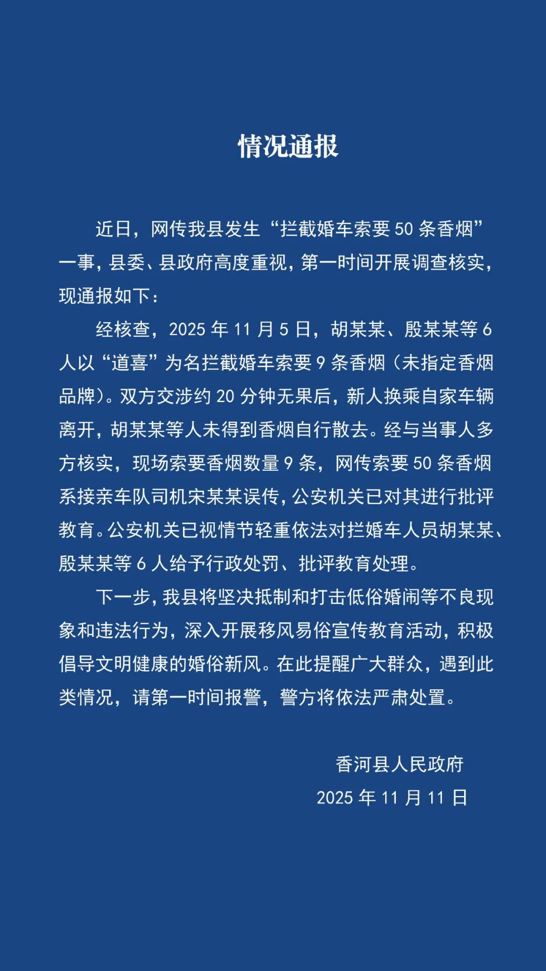 11月11日,河北廊坊香河县人民政府通报:近日,网传我县发生“拦截婚车索要 50 条香烟”一事,经核查, 11月5日,胡某某、殷某某等6人以“道喜”为名拦截婚车索要9条香烟(未指定香烟品牌)。双方交涉约 20 分钟无果后,新人换乘自家车辆离开,胡某某等人未得到香烟自行散去。经与当事人多方核实,现场索要香烟数量9条,网传索要 50 条香烟系接亲车队司机宋某某误传,公安机关已对其进行批评教育。公安机关已视情节轻重依法对拦婚车人员胡某某殷某某等6人给予行政处罚、批评教育处理。